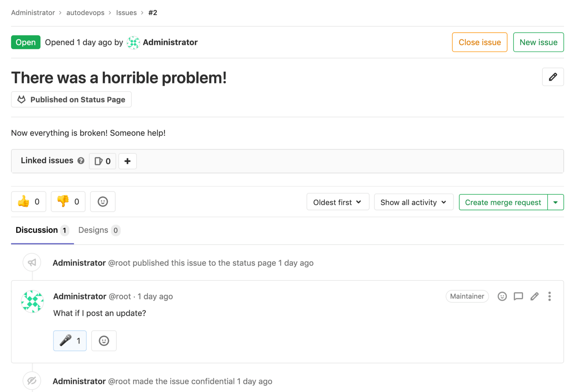 - Create an issue in the project you enabled the GitLab Status Page settings in.