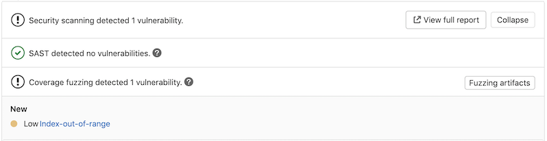 After a vulnerability is found, you can address it. The merge request widget lists the vulnerability and contains a button for downloading the fuzzing artifacts. By selecting one of the detected vulnerabilities, you can see its details.
