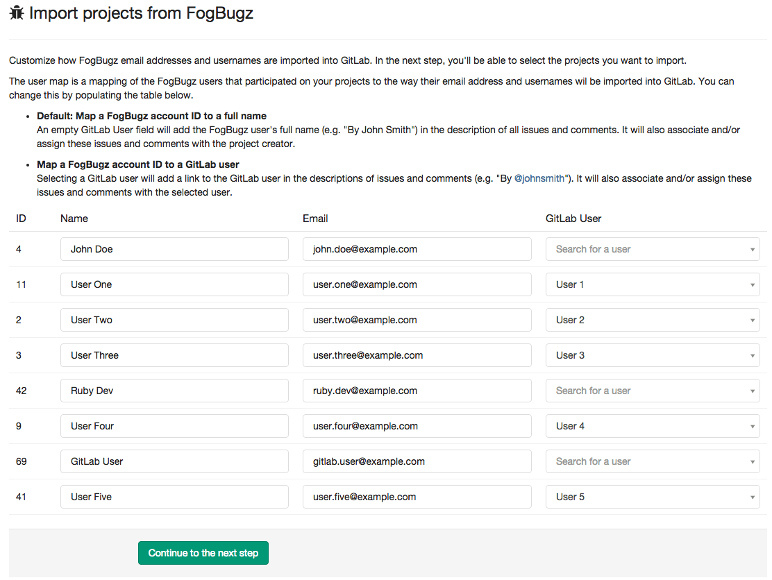 - Create a mapping from FogBugz users to GitLab users.