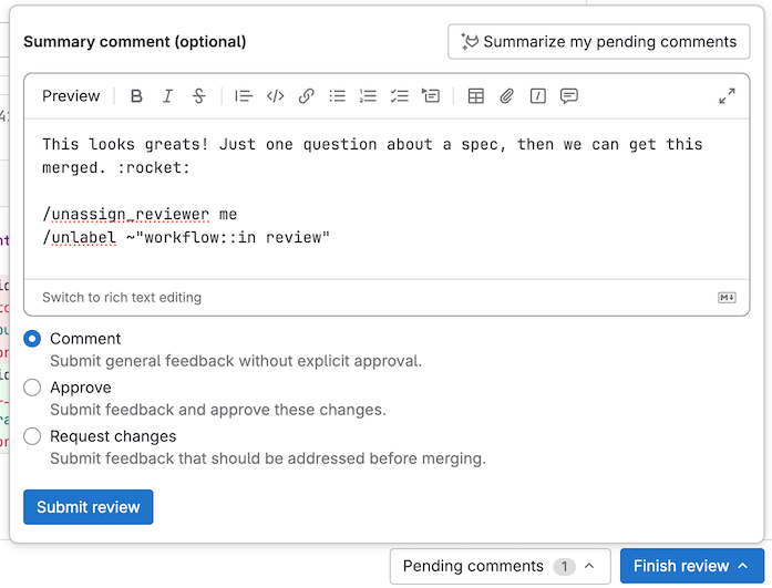 Select Finish review, then select Submit review at the bottom of the dialog. In the dialog, you can supply a Summary comment, approve the merge request, and include quick actions: